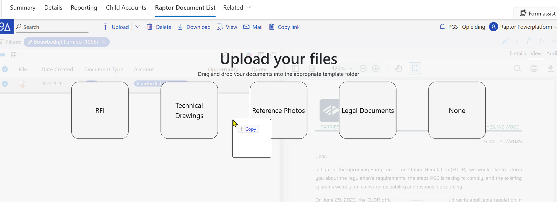 The user needs to drag a document into the correct template.
