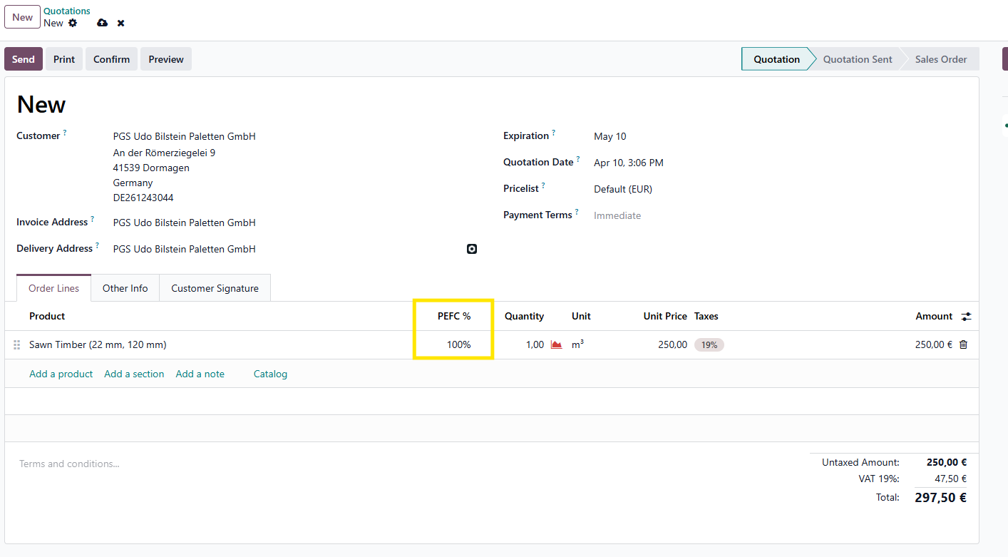 When creating a sales order, on the product line, you will be able to add the PEFC percentage.