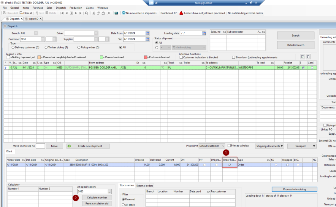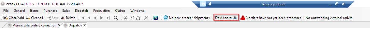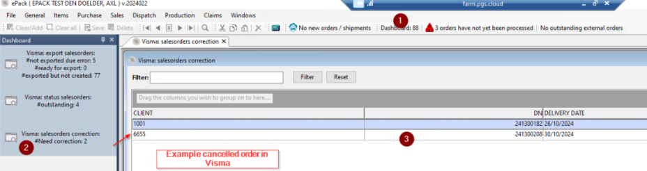 Orders who are not delivered in ePack (dispatch screen ‘zero line’, but delivery date is today (1)) are not exported to Visma (via night processing) and a follow up of orders who are not exported to ePack FE because API failed. Or when a mistake is made (FE prices) the order can be sent back to ePack from Visma (2).